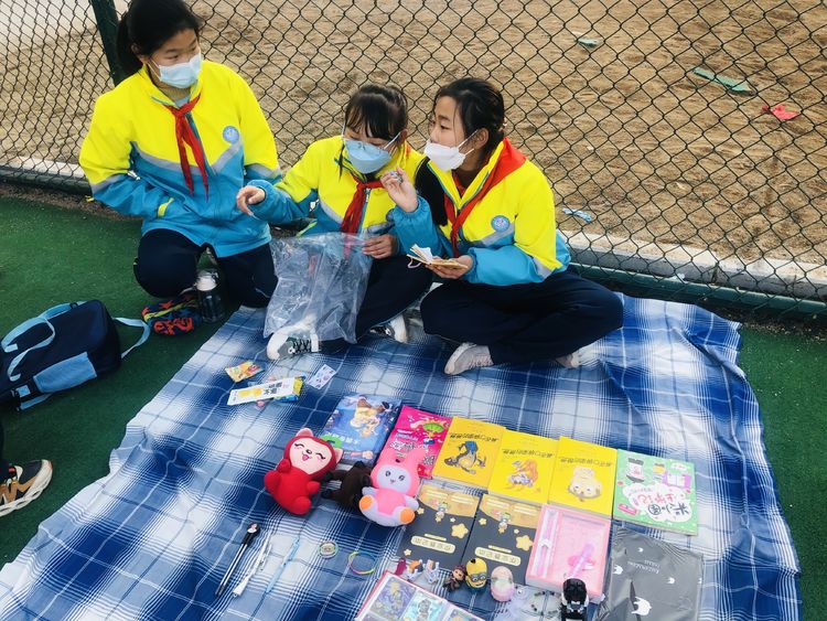 学生们坐在自己的摊位前,纷纷成了有模有样的“老板”,热情地向往来的小顾客推销自己的商品,招揽生意,耐心为小顾客服务。