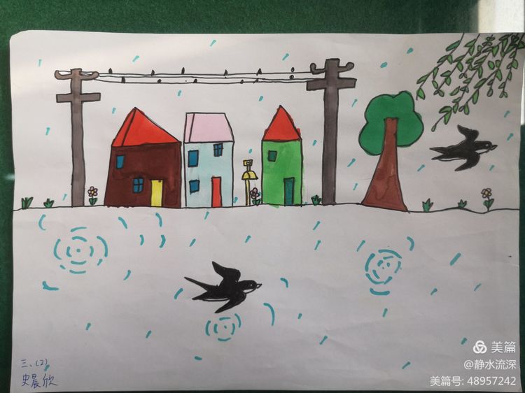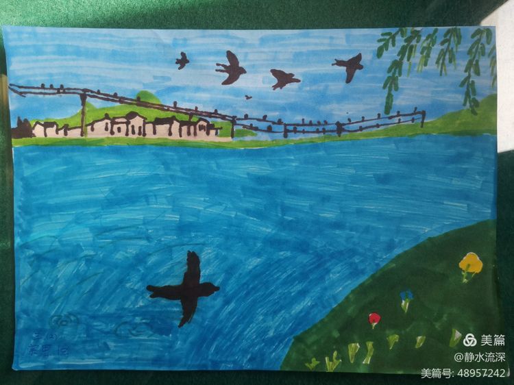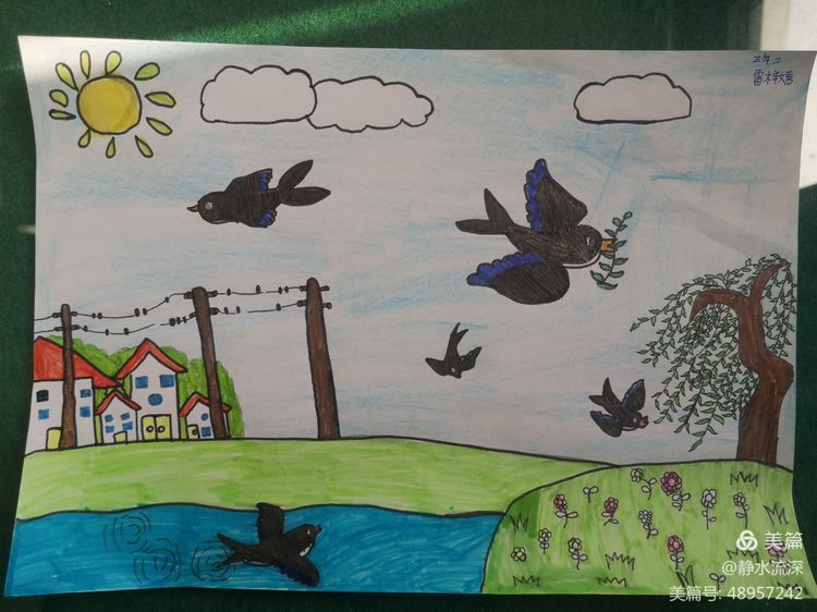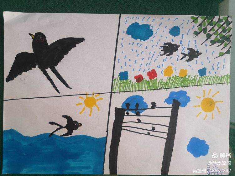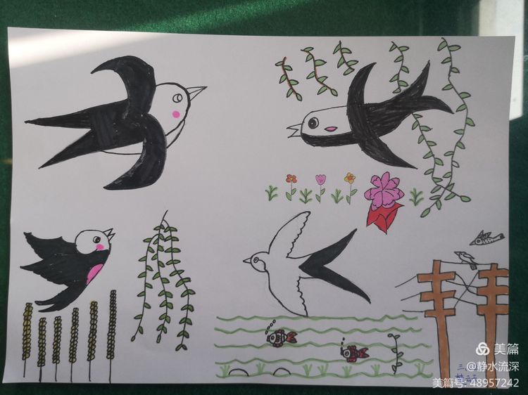 小画家们将课文中文字描述的四幅图:燕子外形图、春光燕子图、燕子飞行图、燕子休息图完美的用图画呈现在我们眼前,言有尽而画意无穷……
