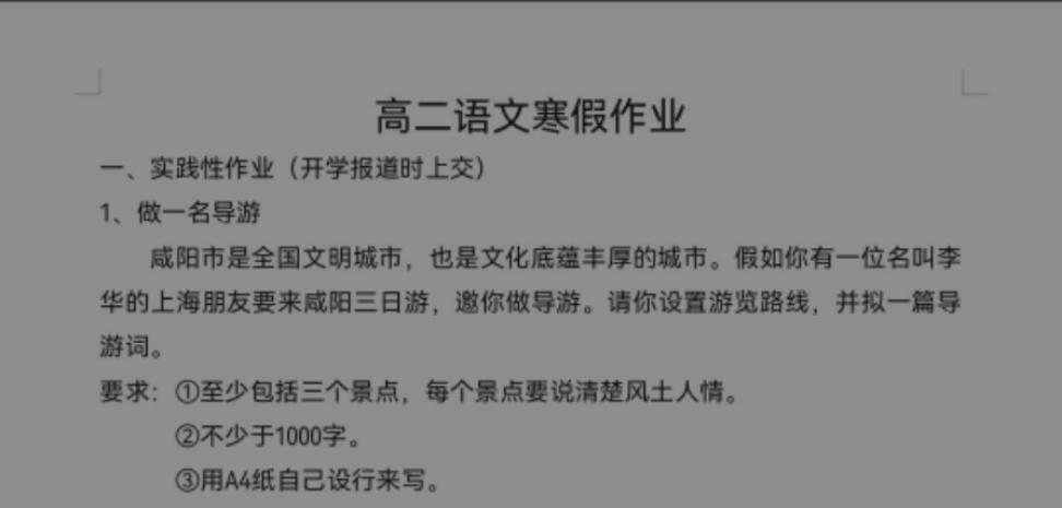 为落实陕西省“三个课堂”,促进学生全面发展,咸阳市高新一中高二年级语文组利用寒假时间给学生布置创新作业,让学生在生活中感受语文魅力。