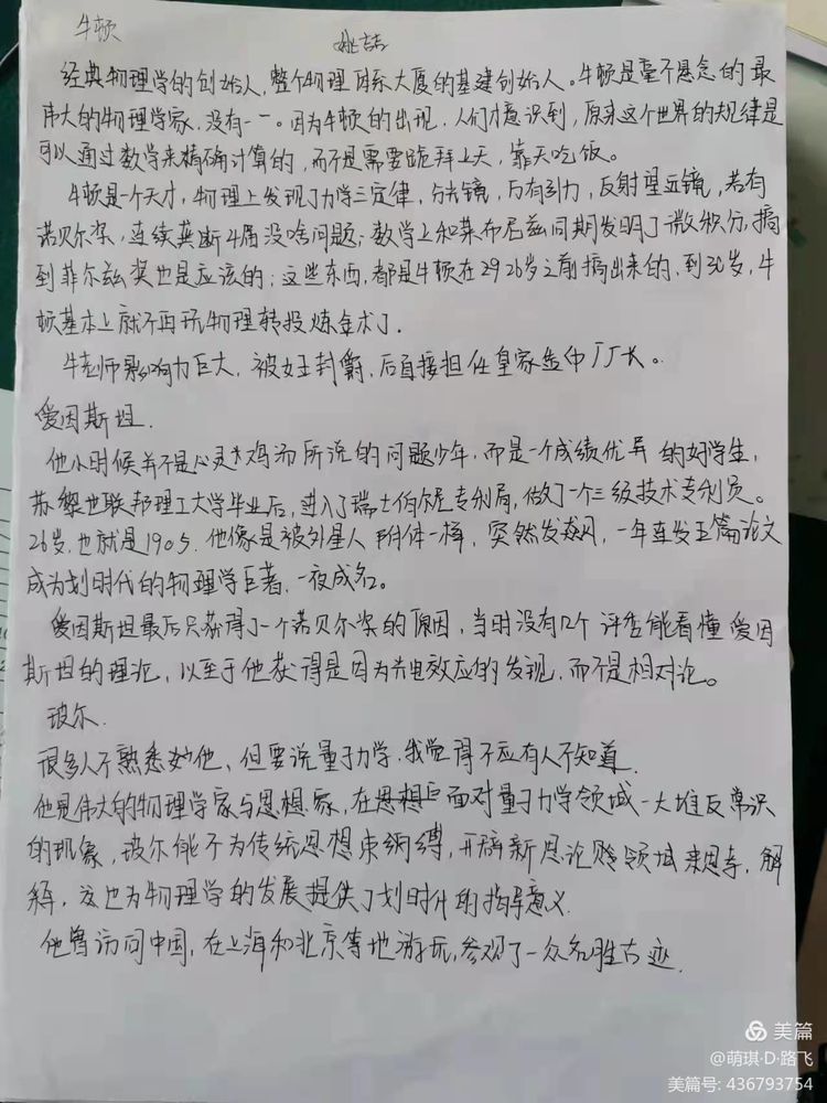物理学历史浩如烟海,那些杰出的物理学家就像流星一样划过漆黑的夜空,为人类文明发展留下浓墨重彩的一笔。同学们利用假期时间,了解了许多伟大的物理名人,感触颇多。