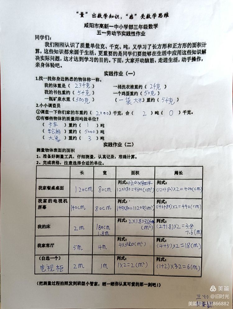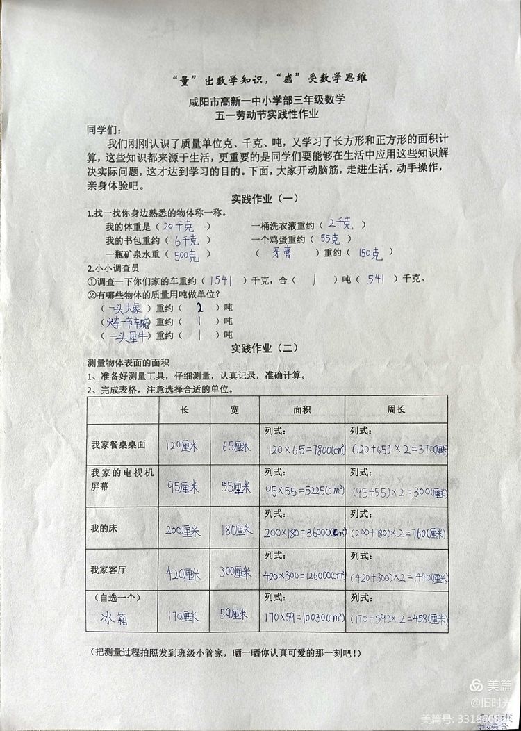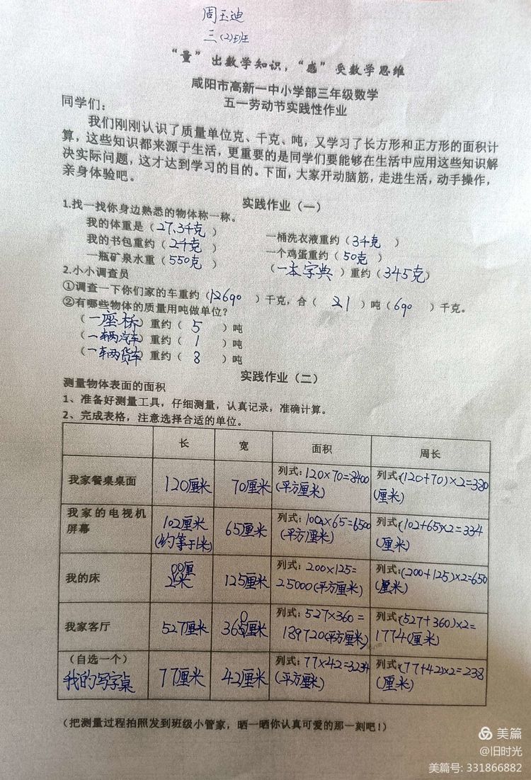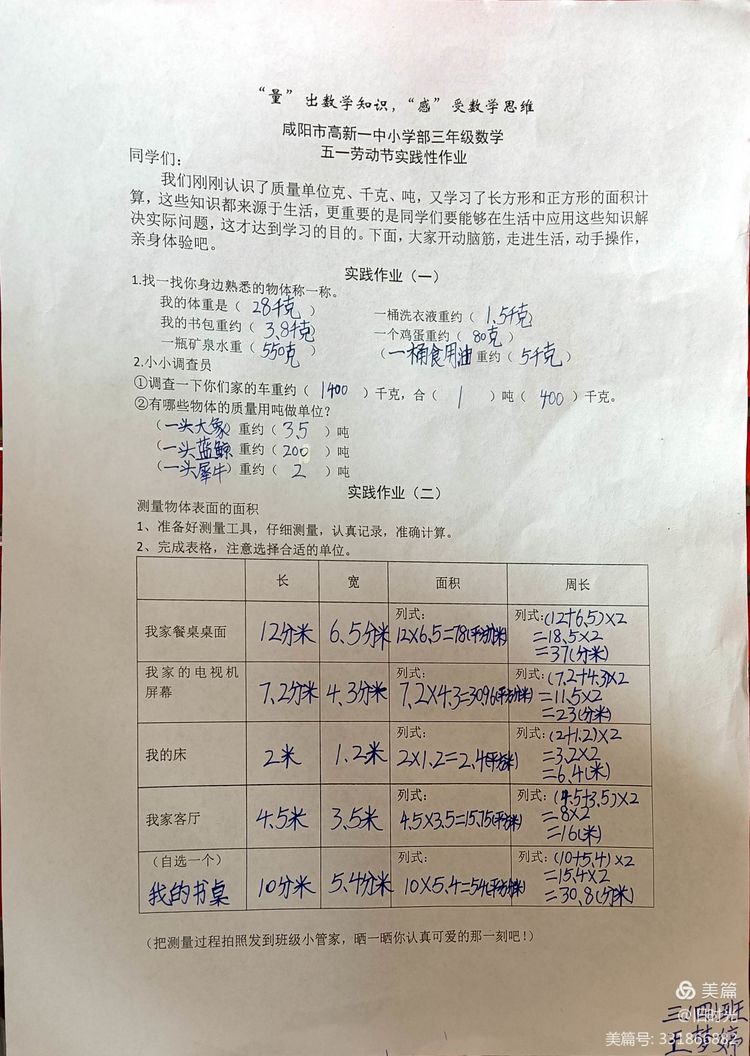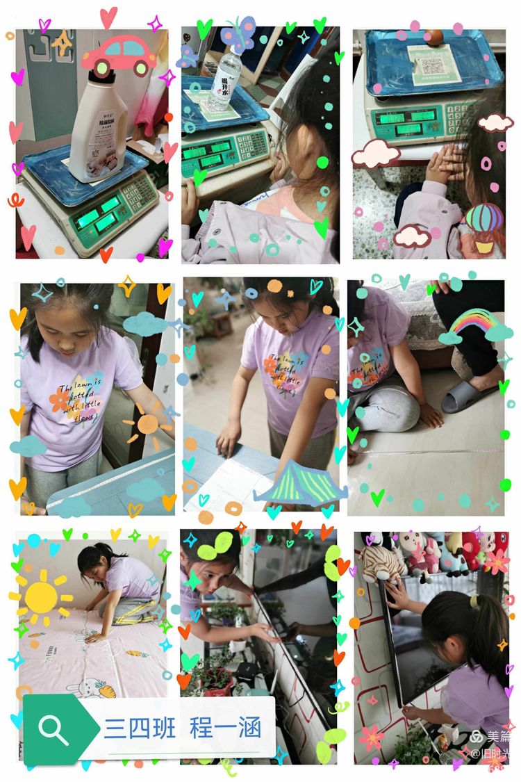 我们刚刚认识了质量单位克、千克、吨,又学习了长方形和正方形的面积计算,这些知识都来源于生活,更重要的是同学们要能够在生活中应用这些知识解决实际问题,这才能达到学习的目的。孩子们个个热情高涨,大展身手,纷纷化身小小测量员,让我们一起来看看他们的成果吧 !