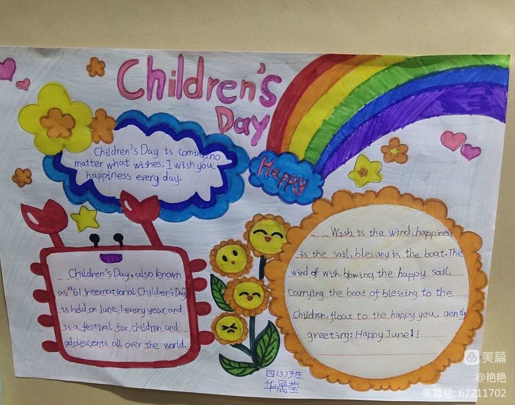 为了更好的“践行”双减政策,激发和培养学生英语学习的兴趣,增强学生的实践能力和动手能力,为学生创设语言运用的机会,让学生在完成作业的过程中能够感受到英语学习的乐趣,咸阳市高新一中小学英语教研组根据新课标要求,单元教学内容特点及本校学生学情,结合中国的一些传统节日设计了一些实践性的趣味作业。以下是儿童节专版实践作业优秀作品,大家快来围观吧!