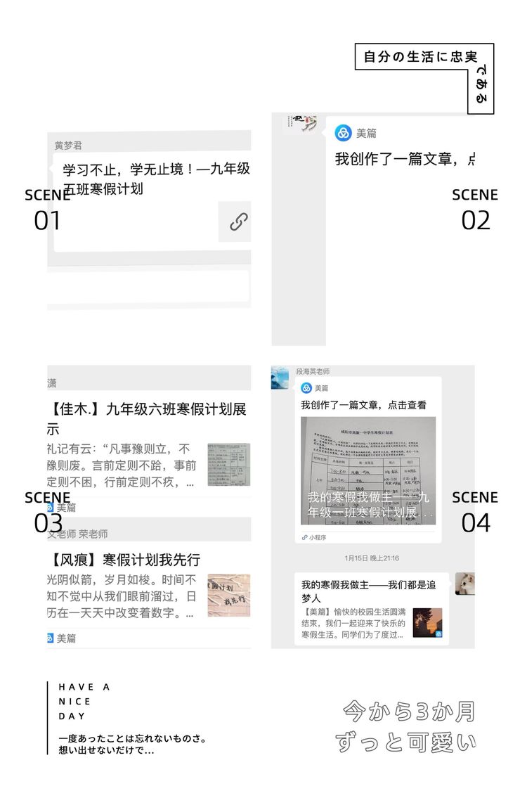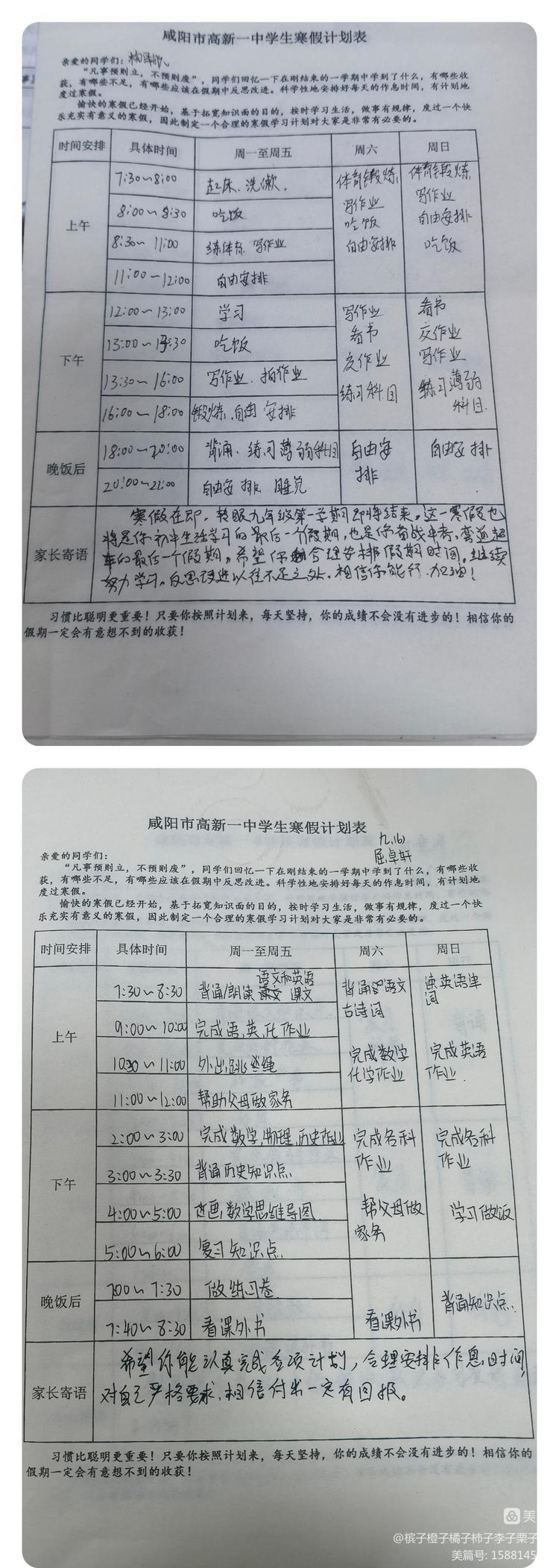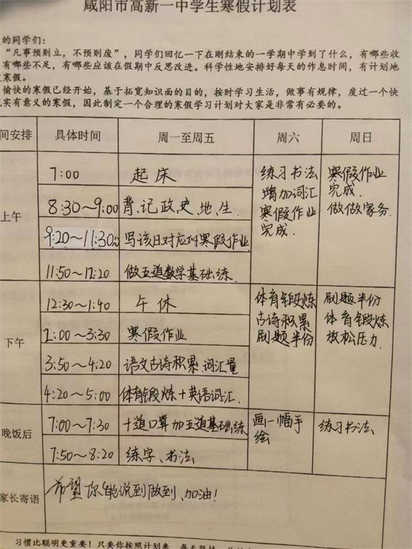 “凡事预则立,不预则废”。假期伊始九年级的同学们就根据自身情况,及时制定了《寒假计划表》。在享受美好假期的同时,还能延续在学校养成的良好习惯,让同学们度过一个有规律、充实又有意义的寒假。