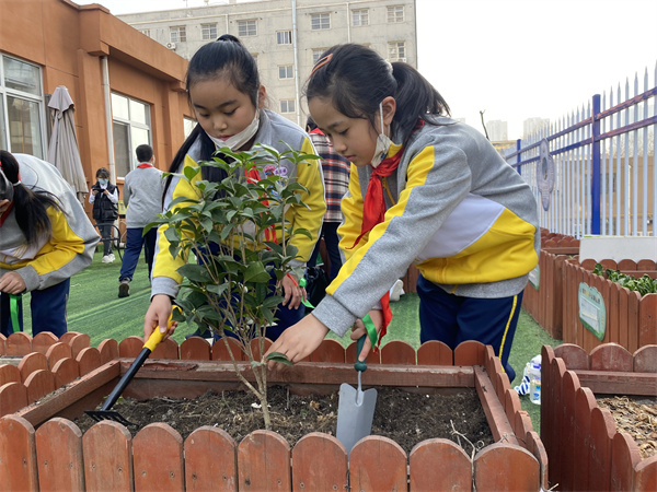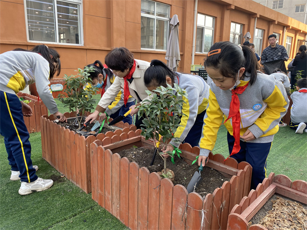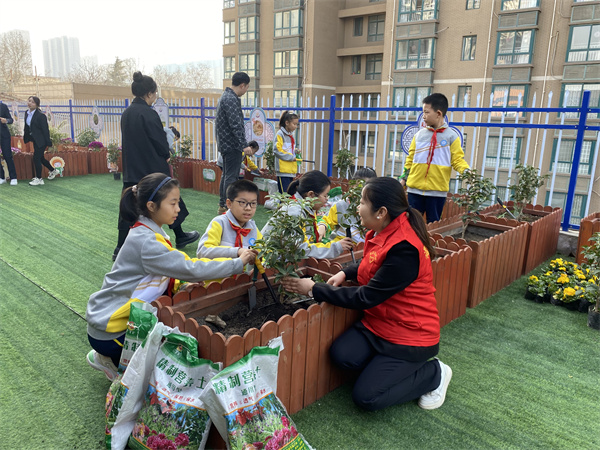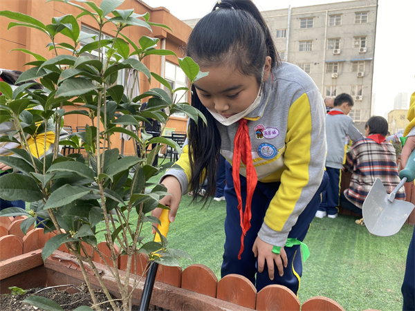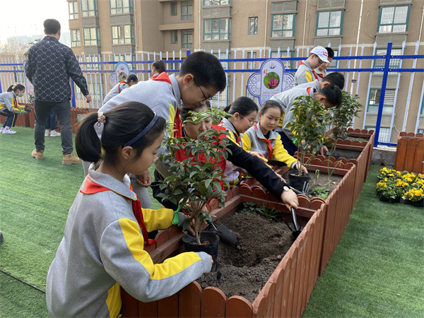 在小学部德育主任郭晓阳的带领下,20名少先队员来到锦华社区,在二楼的露台上少先队员们亲手栽种了小树苗。活动中,少先队员们两两结对,互帮互助,他们表现得非常积极,共同清捡落叶,清除杂草,清理垃圾,为植物浇水施肥,形成了一道靓丽的风线。