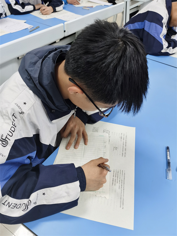 考试中,同学们个个胸有成竹,正襟危坐,他们专注地盯着每一道题,心无旁骛地运算着……物理素养奔腾于笔尖,计算技能洋洋洒洒倾泻于纸上。考场里安静得只剩下笔尖轻盈的“沙沙”答题声。从同学们严肃认真的表情,可以感受到他们奋勇争先的决心和信心。