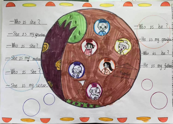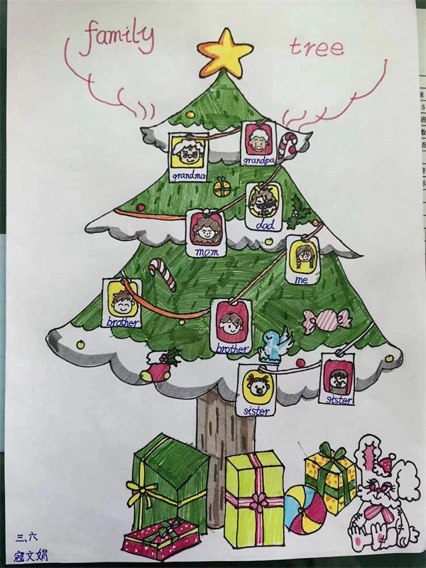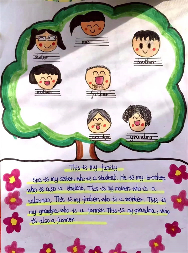 一张张生动又多彩的家庭树在孩子们的手中诞生,仿佛看见那一棵棵挺拔的参天大树扎根在这片土地上!我们运用这种多样化的作业形式,帮助了学生记单词,也帮助了学生了解我们中国文化!我们学习英语是为了了解西方文化,是为了更好的走出去,但我们更要走回来!