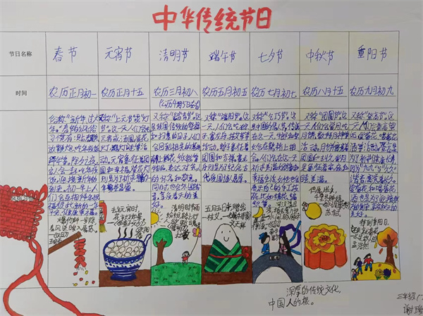 制作“中华传统节日调查表”。学生利用查阅资料、询问长辈等方法对中华传统节日有初步的了解,明白每个传统节日的时间、节日主要习俗。调查的资料可以用表格、思维导图或者其他的不同形式的方式呈现出来