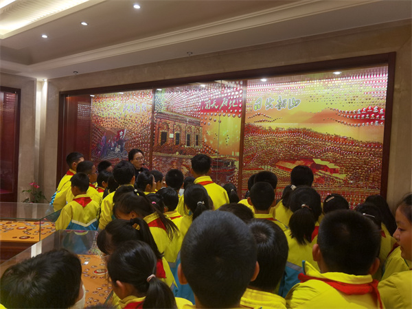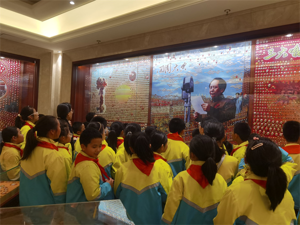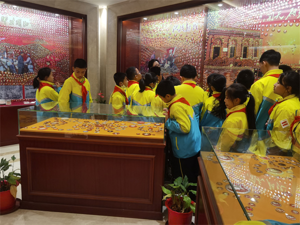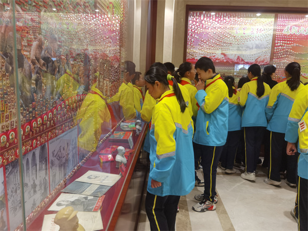在老师和导游的带领下,五、六年级十月份星章学生们有序地走进了步长制药“毛主席纪念章收藏馆”。一踏入展厅,他们就被琳琅满目的纪念章所吸引,纷纷驻足观赏,仔细端详。