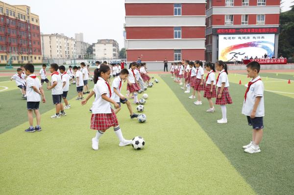 阮斌老师融游戏于教学于一体,用“开列车”的方式带领学生进行热身,所有人第一站举左手,第二站举右手,第三站举双手,提高学生注意力,让学生感受到集体的重要性。在足球展示课部分,阮老师带领学生进行脚内侧传球、直线运球、射门练习等基本训练,向大家展示了别样的体育风采。