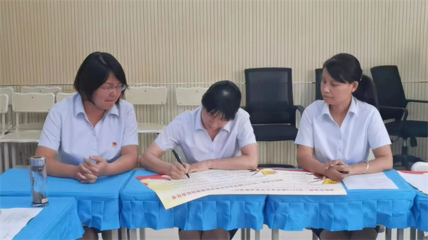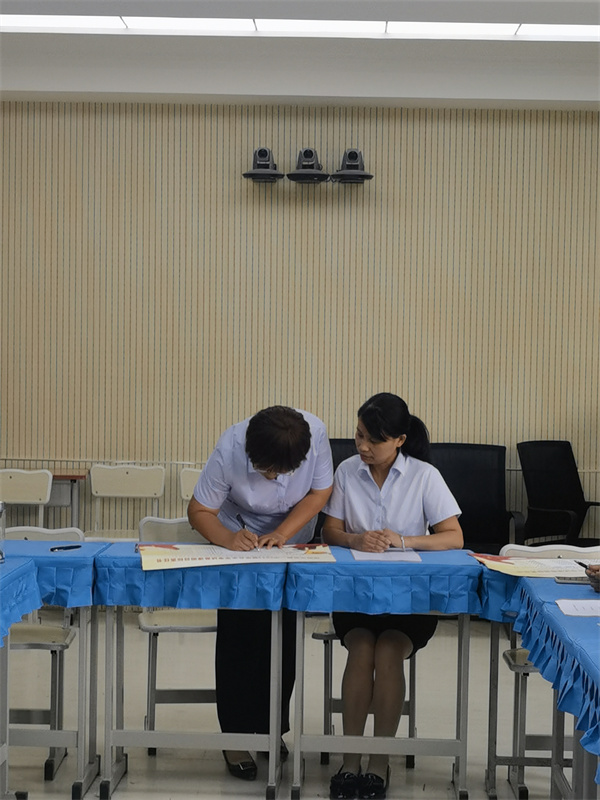 接下来,年级组长王潇老师和段主任签订班级中考目标责任书。王潇老师谈到虽然面对中考目标有很大压力,但同时也从九年级组这个大家庭中感受到了源源不断的力量。相信每一位老师都能够精诚团结,心往一处想,劲往一处使,赢得明年中考的全面胜利。