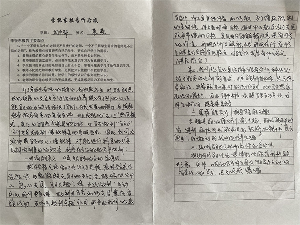 关于《如何培养学生的学习习惯》,李老师结合自己多年的教育经验,从如何教会学生学习,如何何将学生的无意识学习转变为有意识学习,如何帮助学生将感性认识转变为理性认识等几方面作了详细生动的介绍,并列举了很多实际发生的案例,不论是正面的还是负面的案例都让人印象深刻。大家听完报告后,认真研读反思总结,并将李老师传授的理论应用到日常教学当中。