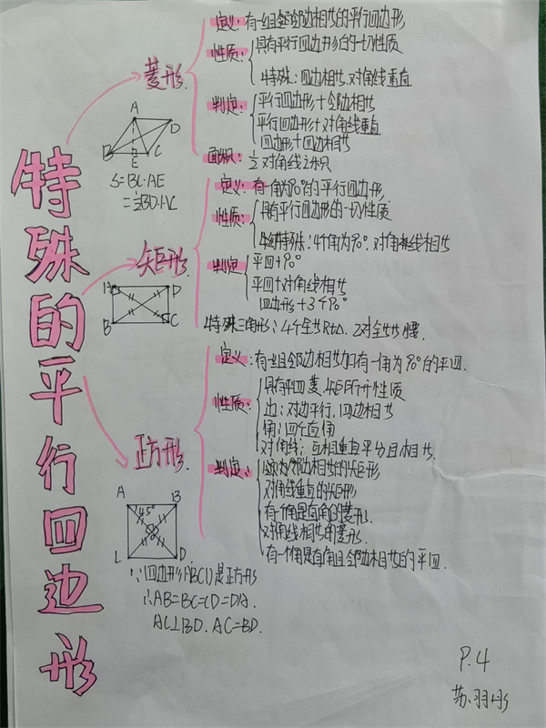 本次活动,学生以数学手抄报或思维导图的形式,体现了对于特殊的平行四边形这一章的理解。帮助了学生更好的记忆,理解重要定理。这也是本次九年级组活动的意义所在。