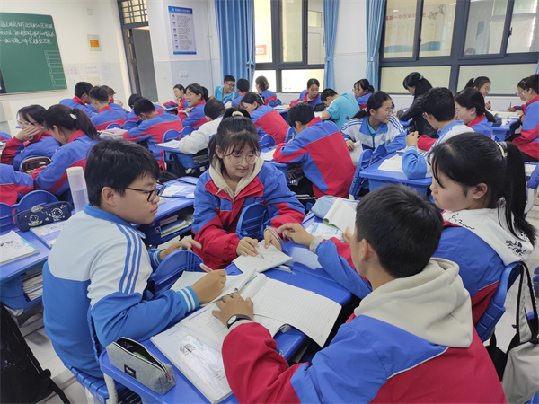 曹老师在课堂中以加分鼓励学生小组内全员完成学习任务。同学们也积极讨论,热情高涨。