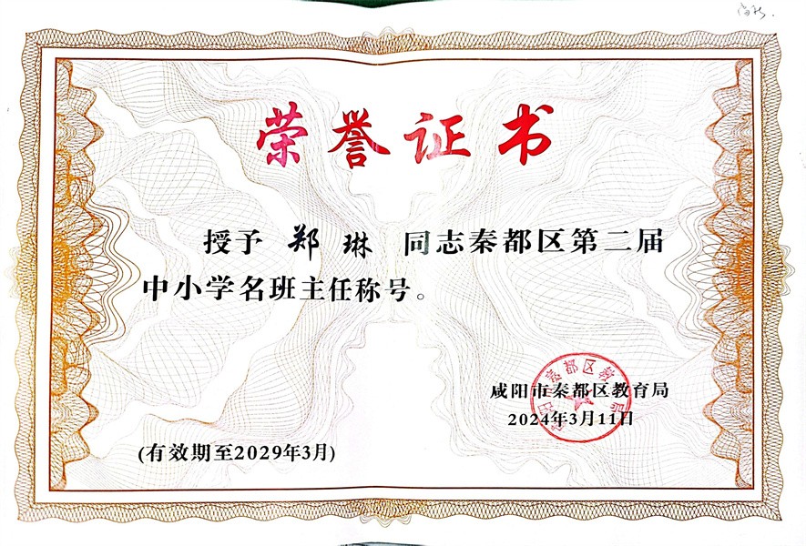 名班典范:荣获“秦都区名班主任”称号,这不仅是一份荣誉,更是对卓越班级管理艺术与深厚育人功底的生动诠释,是桃李不言下自成蹊的芬芳回响。