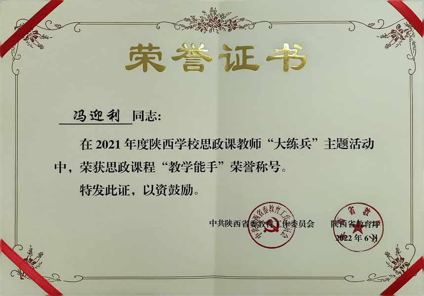 冯迎利,共产党员,咸阳市高新一中初中道德与法治老师,陕西省教学能手、陕西省思政课大练兵教学标兵、国家二级心理咨询师。