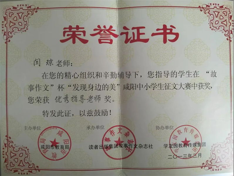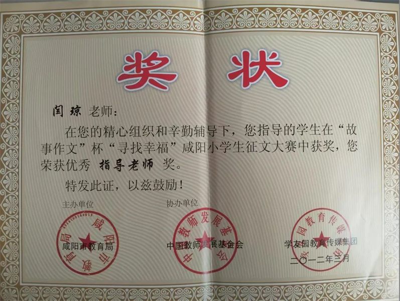 2006年荣获市级语文教师基本功大赛三等奖,2006年荣获区级教学质量优胜奖,2013年荣获区级“模范班主任”,2017年荣获区级“教育教学先进个人”的光荣称号,2019年荣获区级微课题特等奖,2019年荣获陕西省教育学会颁发的《嫦娥奔月》教学设计二等奖,2012-2014 连续三年获市教育局主办的征文大赛优秀指导老师奖, 曾多次荣获校级“师德标兵”、“教学质量标兵” 、“优秀教师”、“优秀班主任”。