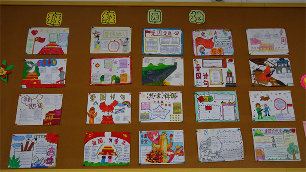 小学部的教室里,孩子们的手抄报贴满了整面墙,他们用彩色的画笔描绘着对祖国美好的祝福,用整齐的诗句表达着对祖国真诚的热爱。