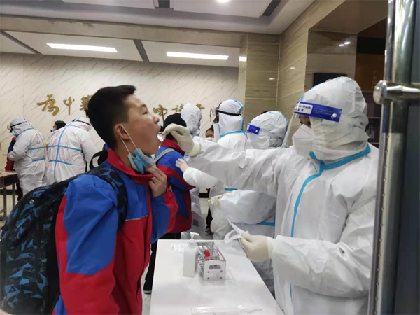 高新一中的志愿者们身穿防护服,用手机扫描学生们手中的二维码,认真做好登记工作,不允许出现任何纰漏。党员干部们也纷纷参与到核酸采样工作中,积极组织协调学生排好队,面对学生的疑惑,耐心细心的解答。他们的热情让寒冷的冬夜不再寒冷。