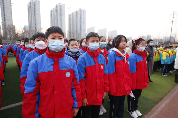 开学典礼在雄壮激昂的国歌声中拉开帷幕,全校师生庄严肃穆,同唱国歌,同升国旗。