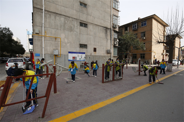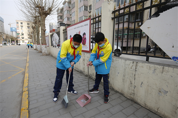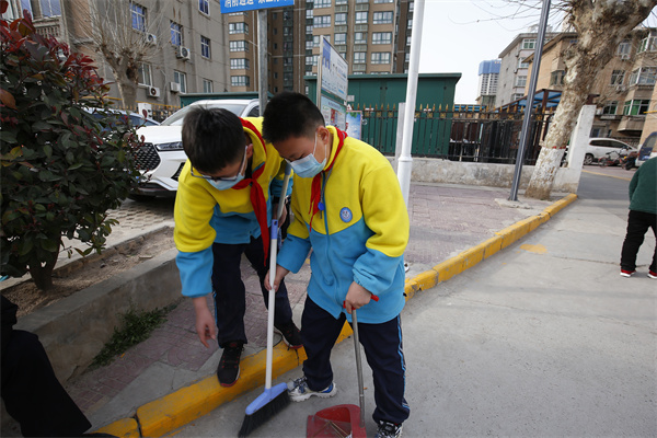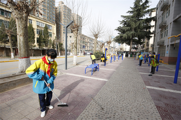 启动仪式结束后,在少队辅导员冯娟老师的带领下,小学部的志愿者们兵分两路,分别打扫学校门口小区内的两条道路和健身器材。大家拿着扫把、簸箕、抹布等工具,认真清扫垃圾,擦掉灰尘,不放过任何一个死角。伸手、弯腰、捡拾等一系列的小举动,充分展现了高新学子良好的精神风貌和道德行为。