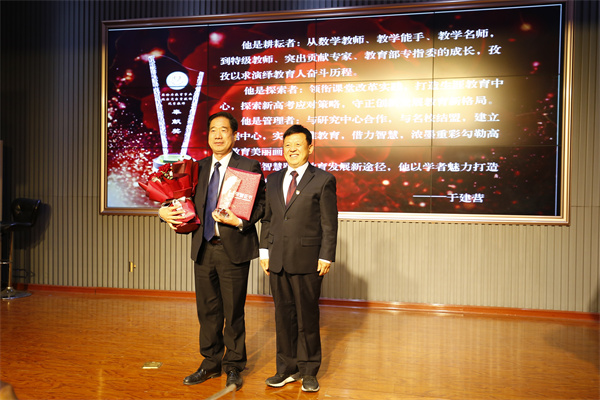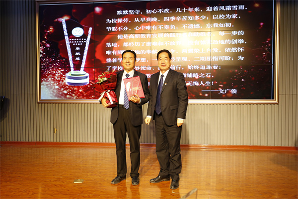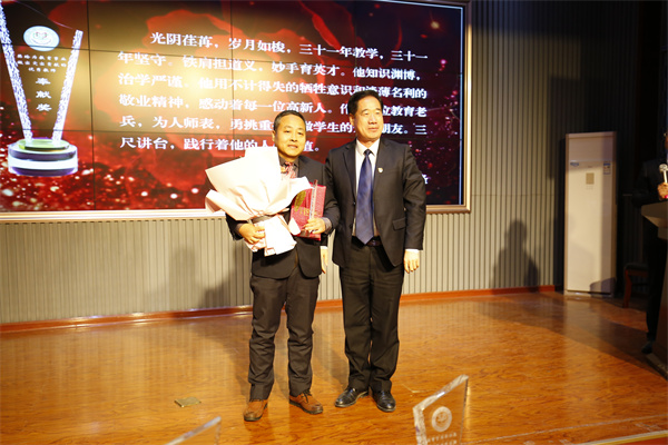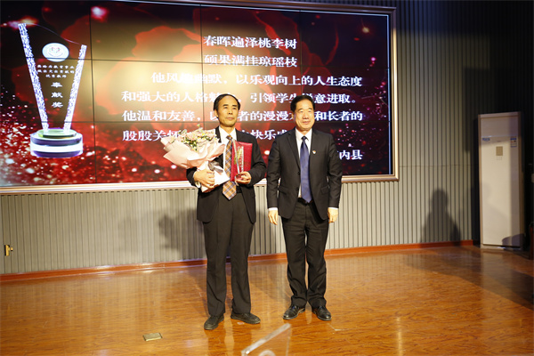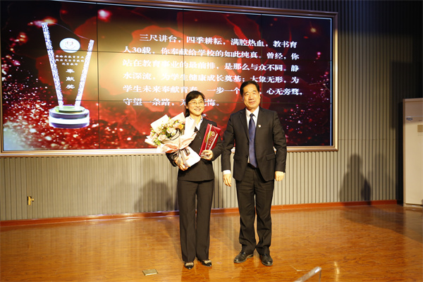 随后大会表彰了程颖斌、贺萍、刘奇、王鑫、徐丽、周轶亚、于红、王内县、张金锋、王倩、文广俊、于建营等12名从教满30年的教师,王胜利老师主持宣读颁奖词。党总支书记、校长于建营、副校长景晓颁奖。