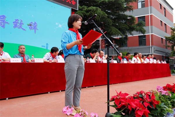 大会特邀高新区管委会副主任杨立、秦都区人民政府副总督学马娟平、渭滨街道党工委书记张杨、秦都区关工委事务中心主任朱莹、高新区管委会办公室副主任李原、渭滨街道办副主任田凯、咸阳宝石钢管钢绳有限公司副总经理李清平、凯迪西北橡胶有限公司党委工作部部长施雪、西北橡胶塑料研究设计院有限公司党委委员党办综合办主任李拴美、咸阳西秦橡胶工业有限公司董事长姚振学、陕西天铭智能建筑有限公司董事长陈晓军等社会各界领导出席,学校党总支书记、校长于建营、副校长景晓、廖荣、杨东、程颖斌、文广俊、李江河、小学部全体师生及部分学生家长共计1500余人参加大会。大队辅导员冯娟主持。