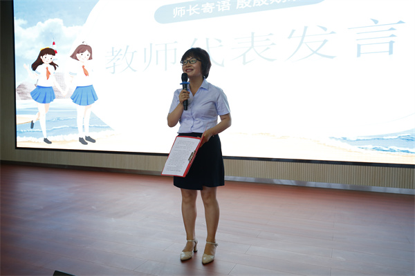 习曼利老师代表全体毕业班老师发言。深情回顾了师生三年来一起奋斗、拼搏的岁月,嘱托同学们心存敬畏、心存感恩,祝福学子们在新的人生港湾,追梦远航!