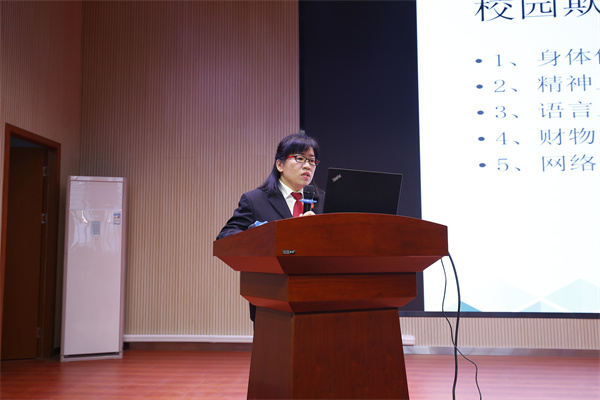 随后,法制副校长林丽丽为高新学子作了题为《校园欺凌与暴力防范》的法制报告。林校长用通俗易懂的语言和生动的案例为同学们讲解了基本的法律知识,引导学生树立正确的法制观念,鼓励同学们在日常的生活中要知法、懂法、用法,让青春在法治的阳光下绚丽绽放。