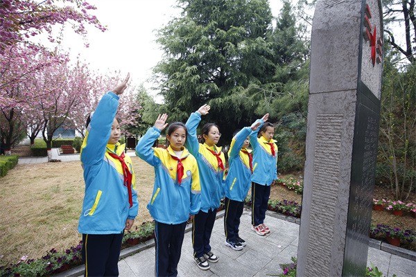天阴沉沉的,陵园内平日开得正艳的小花低下了头,碧绿的小树叶上挂着晶莹的泪珠。同学们在烈士纪念碑前列队瞻仰,高亢的国歌声中烈士们为了民族的独立和人民解放事业流血牺牲的场景历历再显。