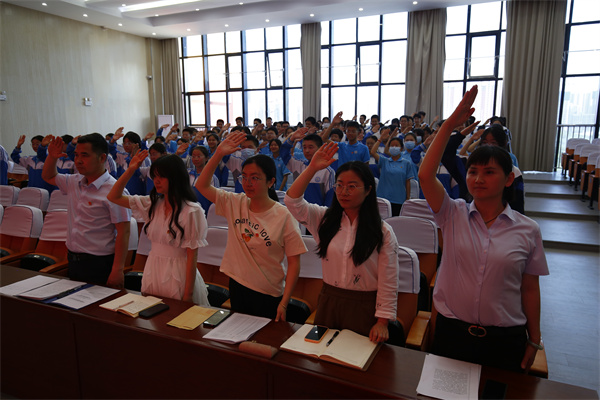 仪式上,副校长李江河、团委书记雷晗静等分别为新团员佩戴团徽,宣布他们正式加入共青团大家庭。