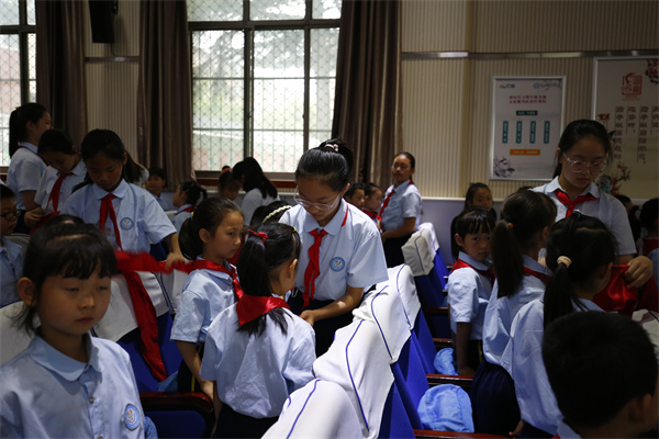 红领巾是光荣的象征,戴上红领巾,就多一份责任,戴上红领巾,就要为它增光添彩。六年级队员逐一为新队员佩戴红领巾。