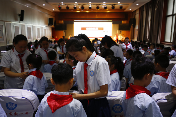 大队干部们认真的教新队员们戴红领巾,队员们脸上洋溢着自豪的笑容。