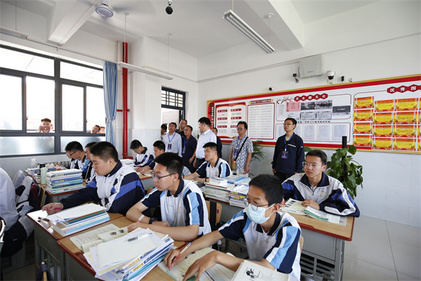 在高中部教导主任陈福民、高中部德育主任崔广伟的带领下,研修班一行分别参观了我校大数据中心、多功能会议室、双师班、电子班牌、诚信超市、读书吧、学科实验室等,先进的基础设施建设、信息化的教学设备、师生向上的精神风貌、优美的育人环境得到了参观人员的一致好评。
