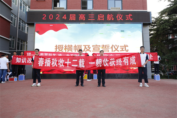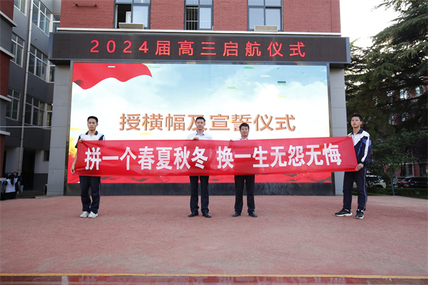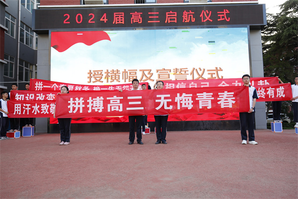 于校长为2024届新高三年级授年级组启航旗帜,廖校长为各班授高三启航横幅。鲜红的横幅和响亮的口号展示了各班奋战高三的决心,展现了奋发向上、勇挑重担的良好精神风貌。新的征程,新的跨越,我们要用新的奋斗去摘取新的硕果。