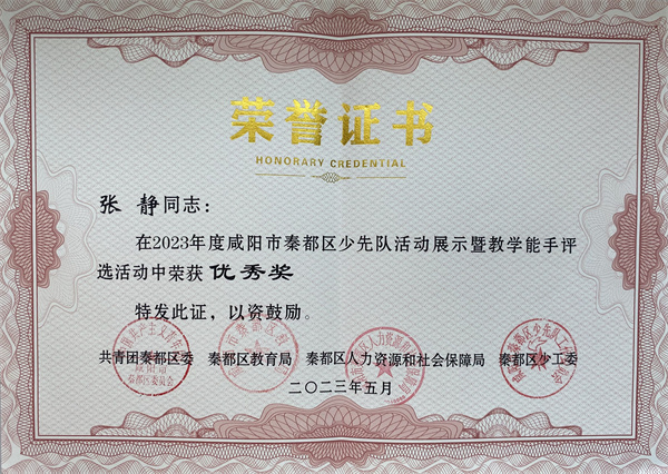 张静老师在2023年度秦都区少先队活动展示暨教学能手评选活动中荣获“优秀奖”。
