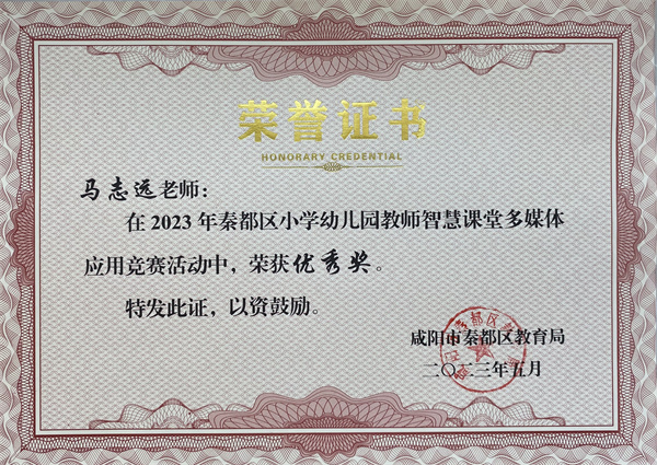 乔转琴、马志远两位老师在2023年秦都区小学幼儿园教师智慧课堂多媒体应用竞赛活动中荣获“优秀奖”。