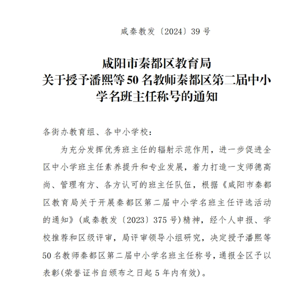 近日,秦都区教育局公布了秦都区第二届中小学名班主任获奖名单,咸阳市高新一中郑琳、黄梦君、牛浩三名教师荣耀上榜。