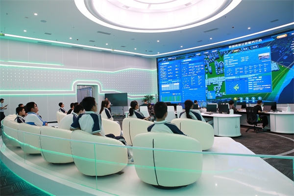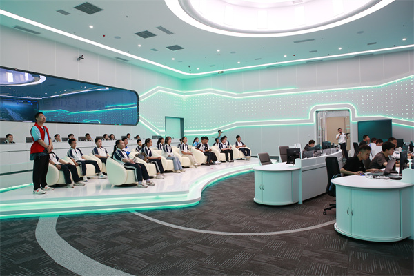 接下来,进入数智高新运营服务中心。这里正前方的巨大弧形电子大屏不断滚动更新显示着各种数据,涵盖了全景高新、产业智治、城市治理、智慧应用和政府运行等多个方面。同学们在这里充分体验到了一个智慧城市的综合运用——“一屏展示、一厅调度、一键指挥”。这种数字化的方式不仅助力了城市治理,还推动了产业发展和经济运行。通过这些实际案例的展示,同学们对大数据的应用场景和数字经济的重要性有了更为深刻的认识。