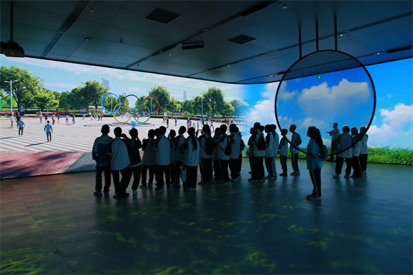 在高新区数字会客厅,学生们首先来到了数字沉浸式展厅。展厅内三面LED屏幕和地面投影技术的应用,以及视觉中心点由光子芯片透明屏结合地幕打造的融合投影,为我们开启了一场从古至今的“元宇宙”沉浸式旅程。通过这场旅程,学生们不仅能够感受到咸阳这座历史名城的发展历程,还能深刻体会到科技与文化、历史的完美结合。