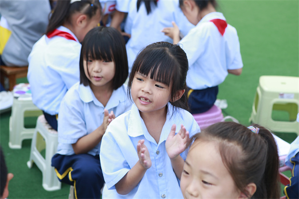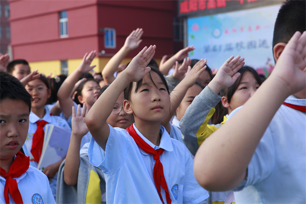 开幕式在庄严的国歌声中拉开帷幕,五星红旗冉冉升起,全体师生共唱国歌,行注目礼、敬少先队礼。