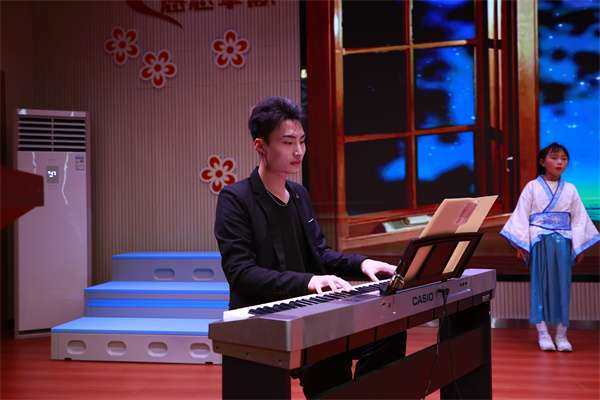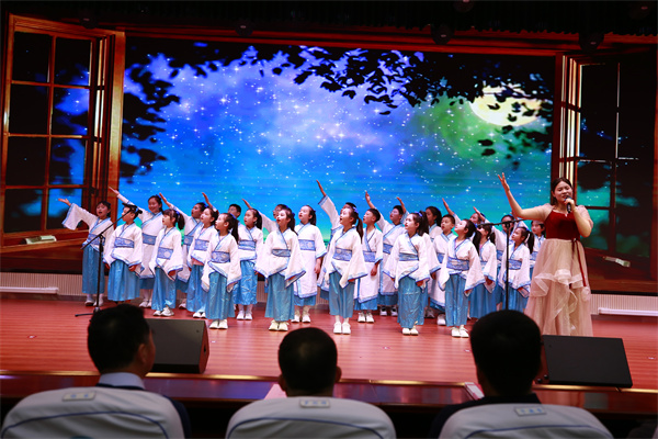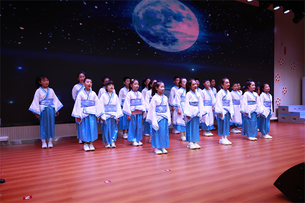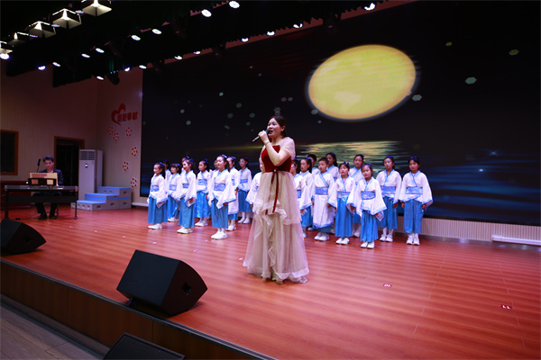 音乐老师王迎以专业示范,带领学生用清澈童声演绎古诗新韵,月光般的旋律流淌在音乐厅每个角落。
