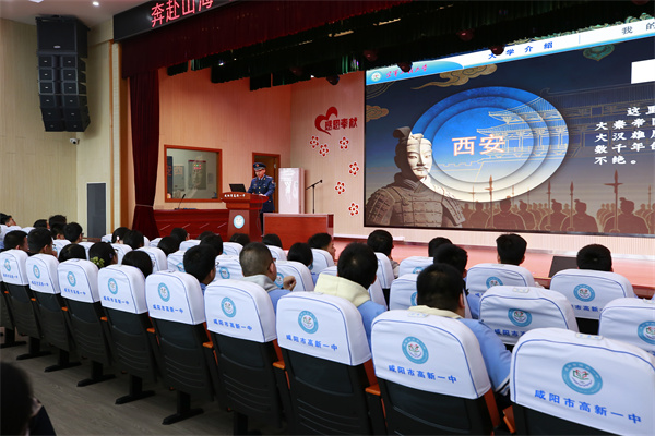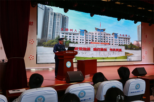 接着,文泽斌同学向学弟学妹们详细介绍了自己目前就读的空军工程大学。他介绍道,作为空军高素质军事人才培养的摇篮,空工大不仅拥有一流的教学设施和师资力量,更注重培养学员的家国情怀与军人担当。在这里,他不仅系统学习了专业知识,更在严格的训练中锤炼了意志,在集体生活中学会了责任与奉献。他用自己的经历告诉大家:选择军校,就是选择了一份光荣与使命;穿上军装,就是扛起了一份责任与担当。