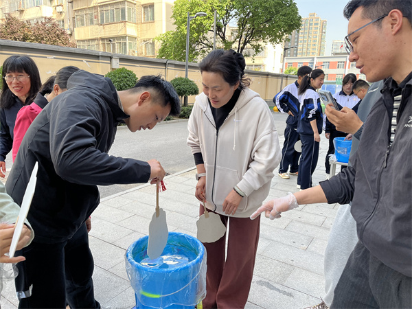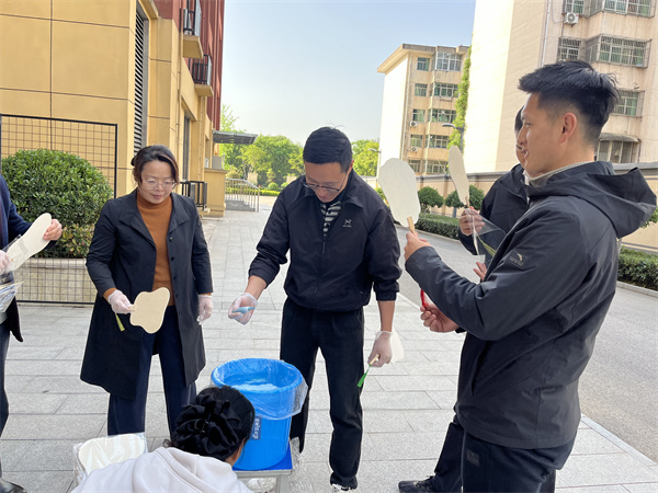 魏老师耐心示范、悉心指导,手把手帮师生调整色彩配比与手法。平日里站在讲台的老师们也放下严肃,和同学们一同体验创作的乐趣,跟着尝试漂漆、拓印,为自己的“第一次作品”会心一笑。师生们都沉浸在创作的乐趣里,从生疏尝试到渐入佳境,感受着色彩与水纹碰撞的奇妙,也体会着慢工出细活的专注与宁静。没有刻板的模板,没有统一的标准,每一把扇子都因创意而鲜活,每一道纹理都因用心而动人。