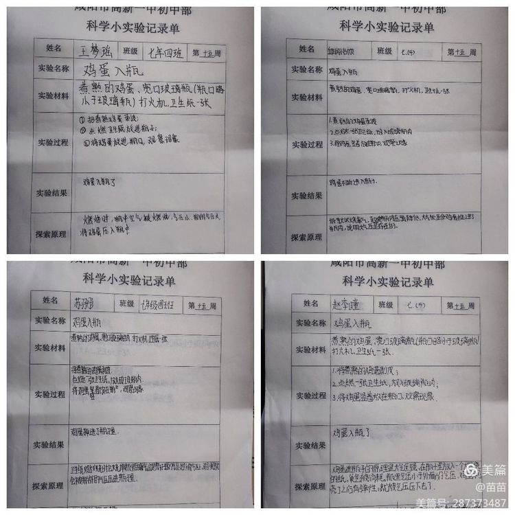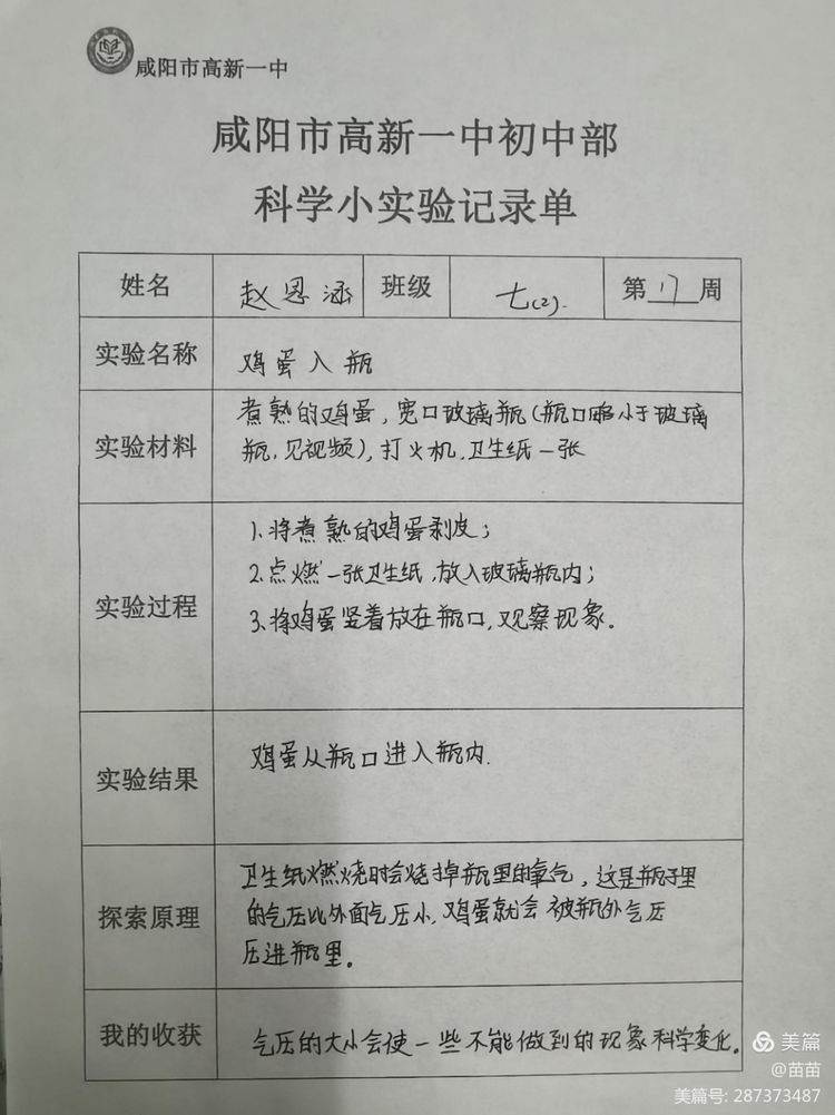 本周我们的周末科学探究小实验是“鸡蛋入瓶”。