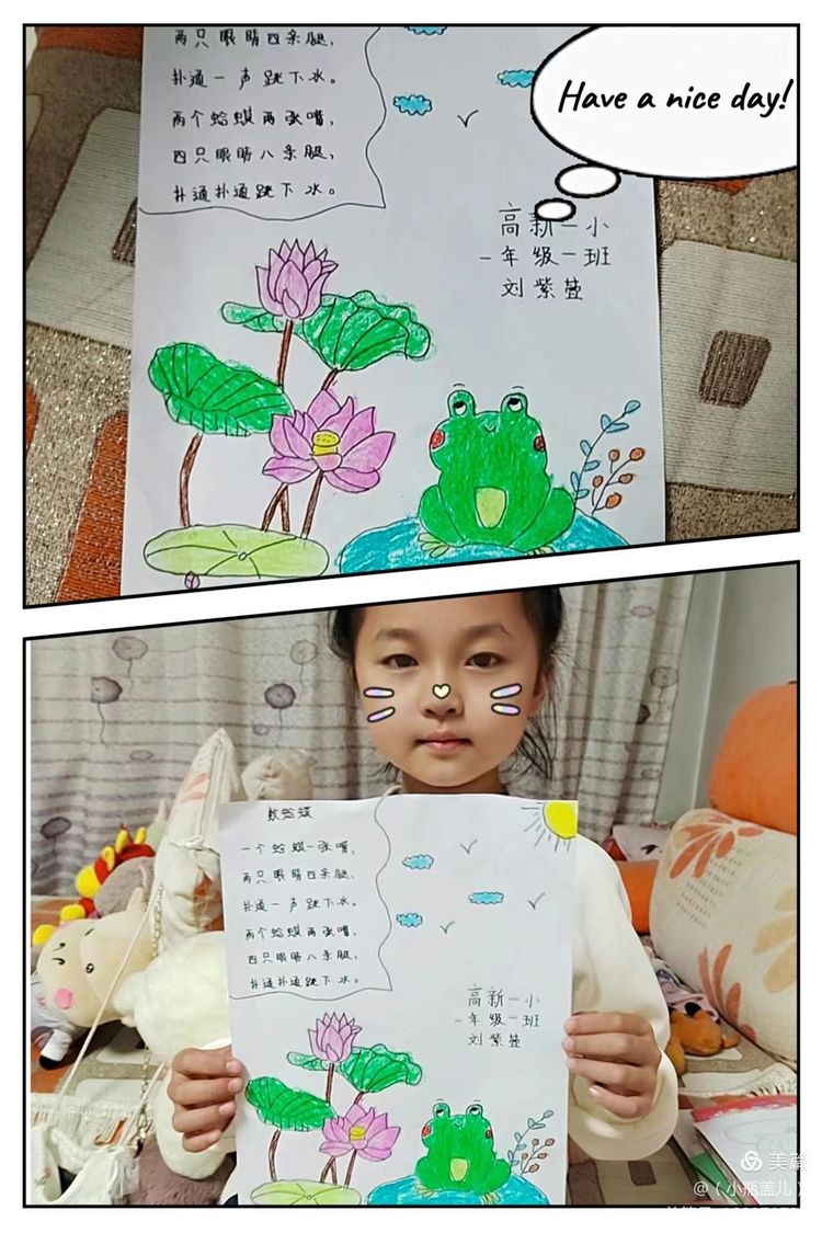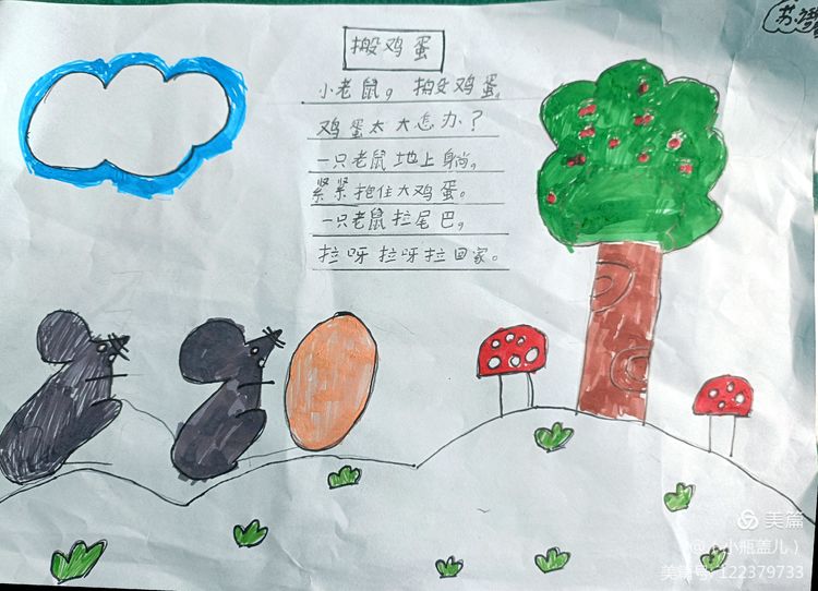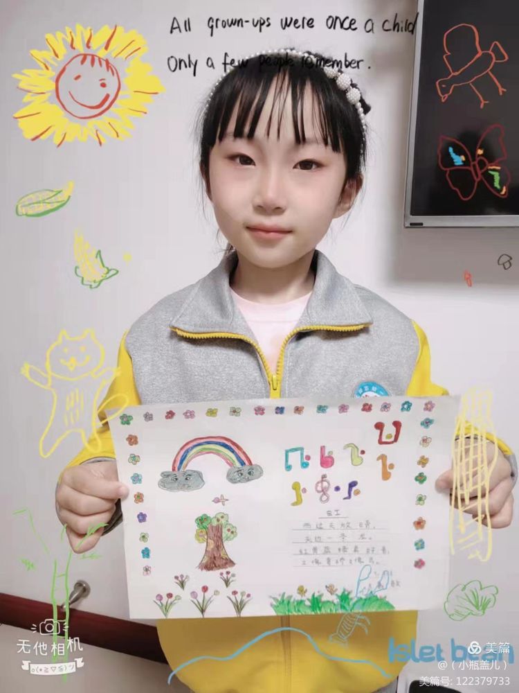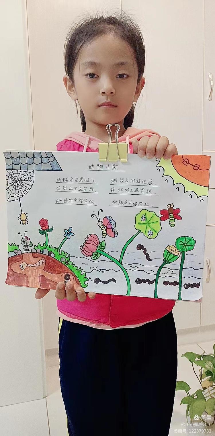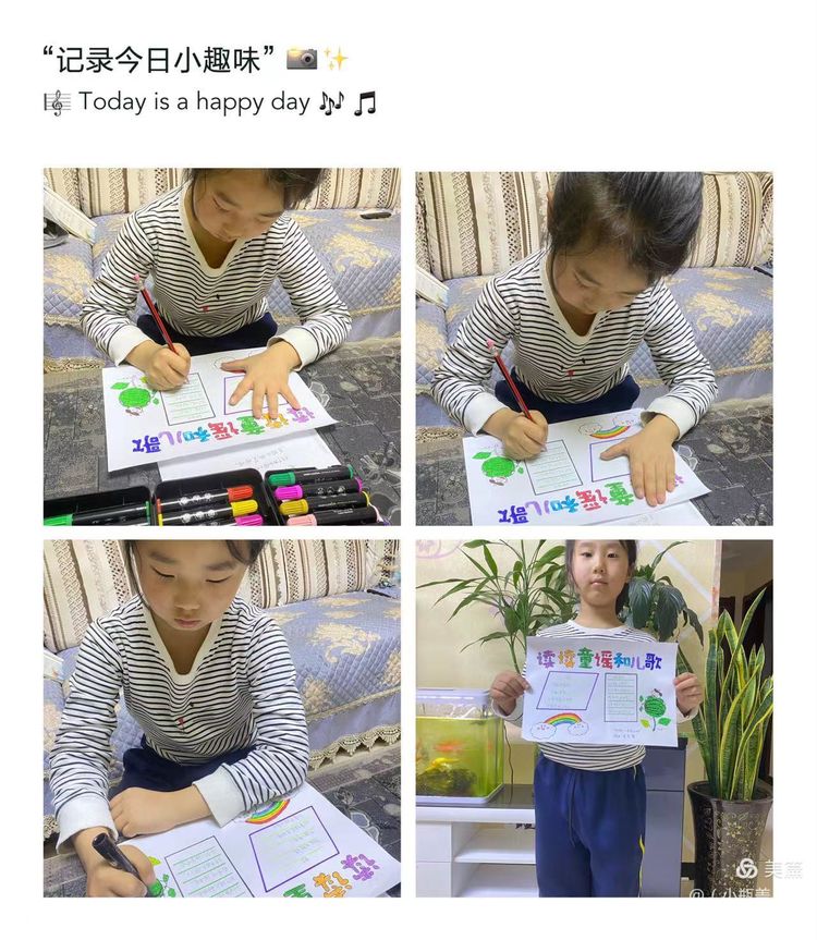 一首优秀的儿歌,不仅能够对孩子们进行文学、艺术上的熏陶,也能够丰盈他们的精神世界,帮助他们树立正确的价值坐标。童谣的题材往往包罗万象,在满足儿童好奇心的同时,亦能让他们从中获得知识经验,感受社会文化,童谣能够传达热爱自然、友好待人、关爱父母、热爱祖国等思想,潜移默化的影响着儿童的思想情操。近期,咸阳市高新一中小学部一年级组围绕阅读读本开展了丰富多彩的实践活动,活动内容包括为儿歌童谣配一幅图画,快乐背诵童谣儿歌并演唱,学习童谣儿歌的手势舞,亲子阅读,课堂检测等等……