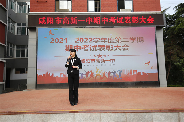 优秀促发展,榜样扬正气。4月27日上午,咸阳市高新一中初中部全体师生齐聚一堂,隆重举行期中考试表彰大会,本次大会由初中教导处主任龚莉莉主持!