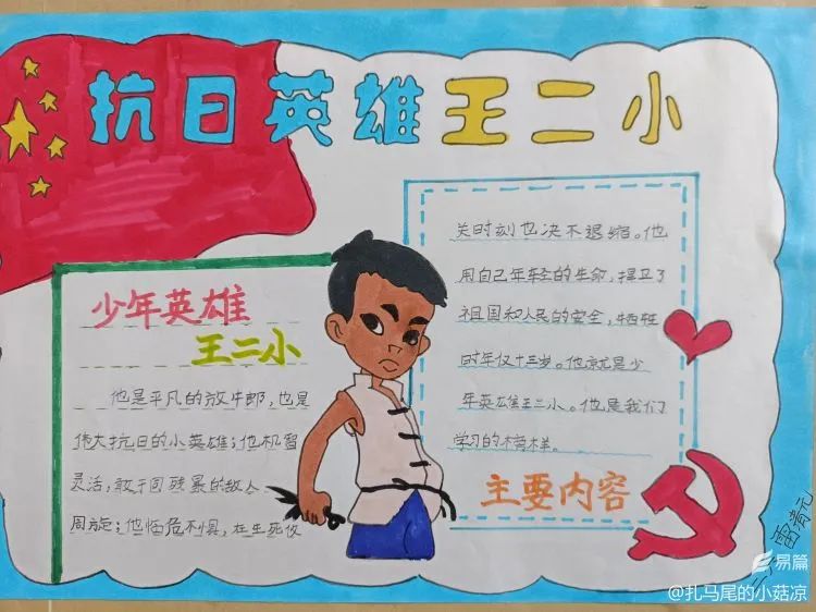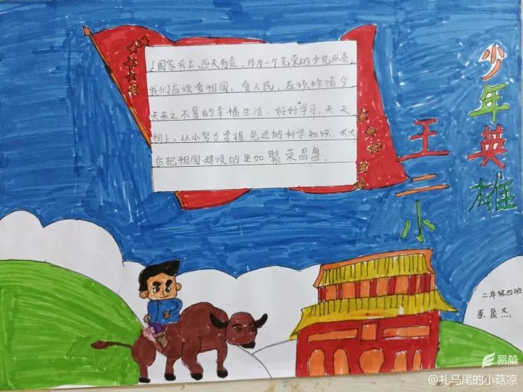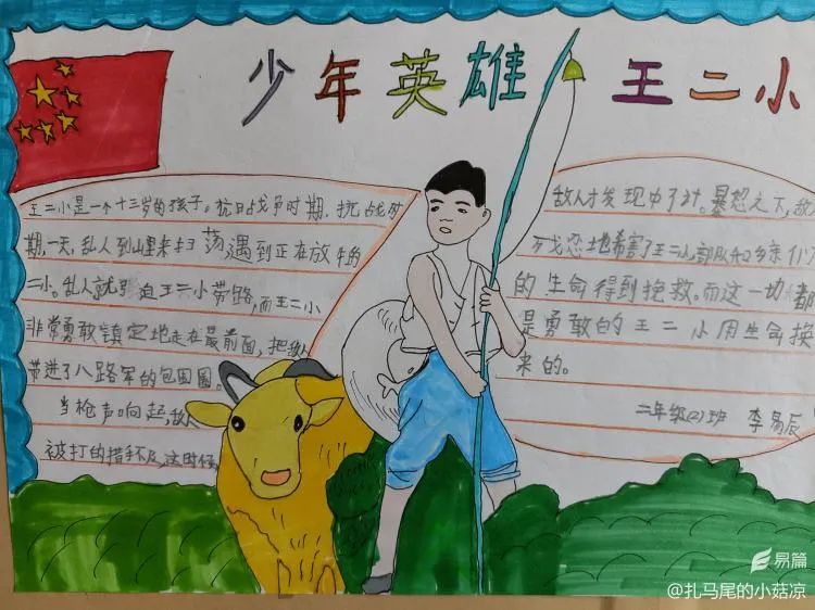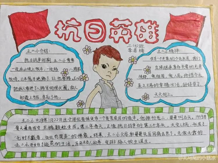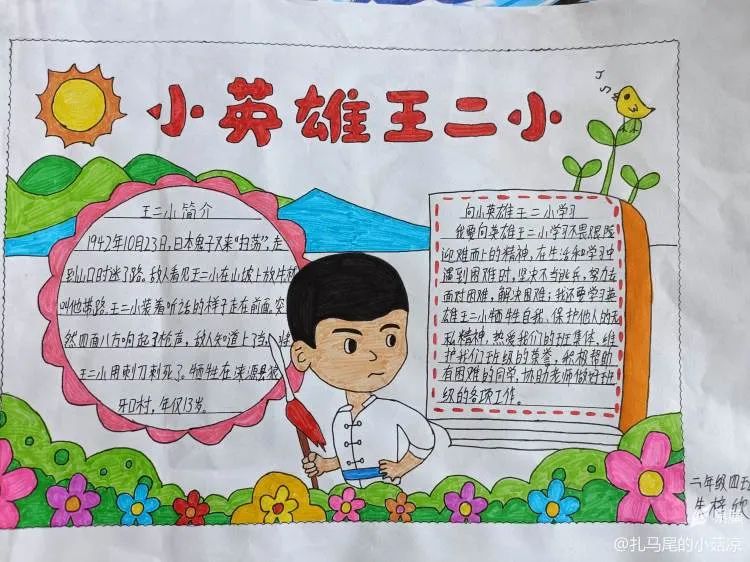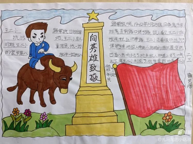 红色基因绵延百年,革命薪火代代传承。英烈铸就了历史,儿童将成就未来。自古英雄出少年,抗战时期中华民族涌现出了一大批少年英雄,他们在民族危亡时刻,用稚嫩的肩膀担负起救国救民的历史使命。二年级的同学们将追寻红色印记,重温少年英雄故事,接力精神火炬,让红色故事浸润童心,让红色精神点亮童年,在故事中认识一个了不起的小英雄王二小。