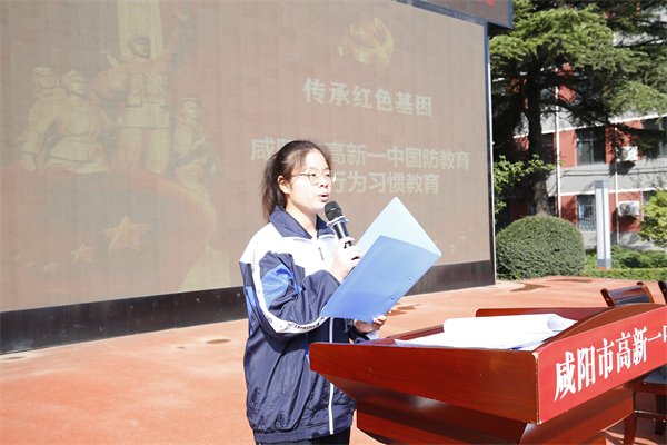 高一(1)班学生代表豆娇阳同学发言,她号召全体高一新生在为期四天的军训生活中,增强体魄,坚定意志,为未来三年的高中学习生活打下坚实基础。