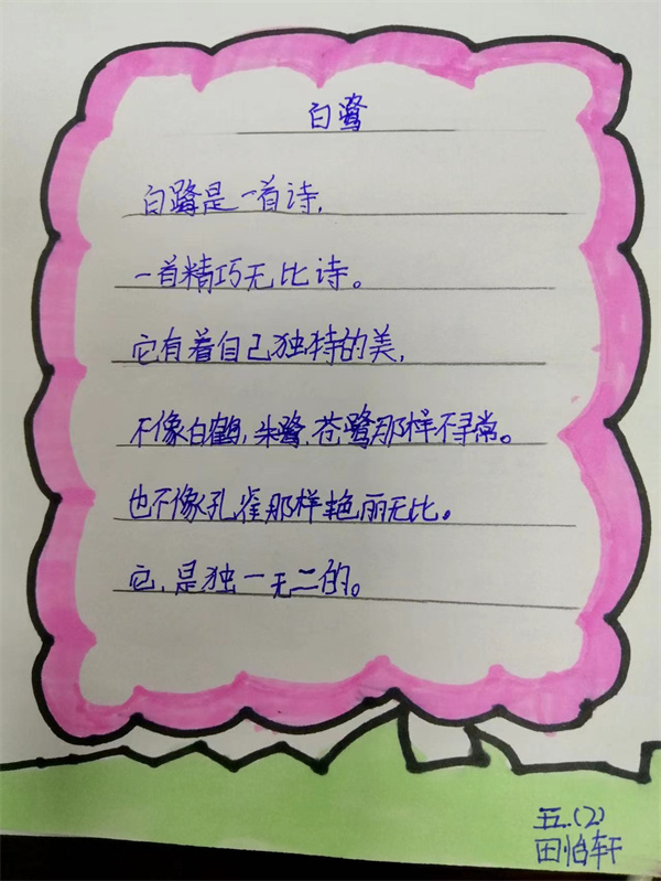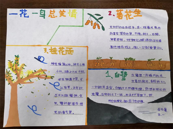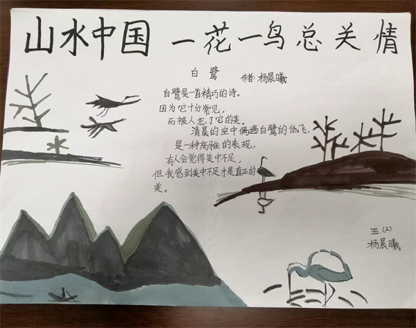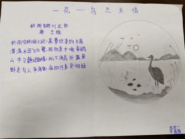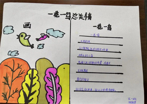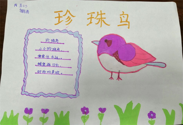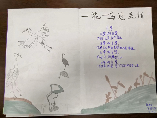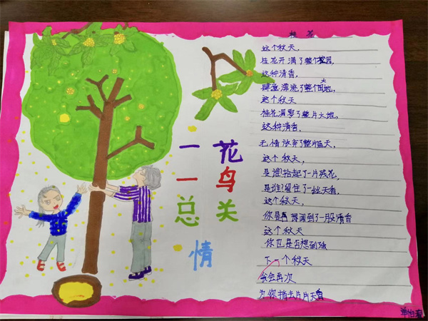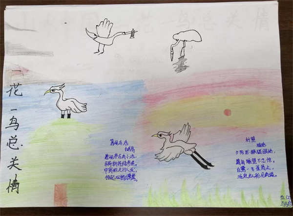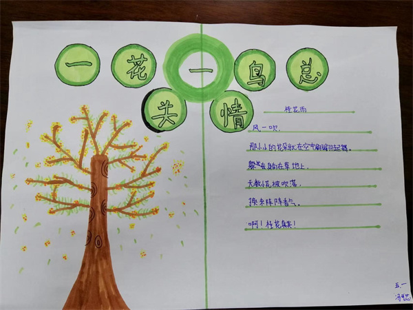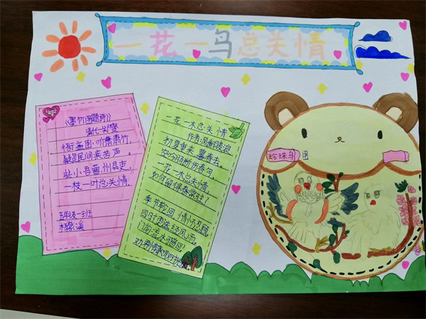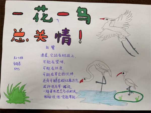 近期五年级备课组结合教材编排,为同学们安排了一次主题为“一花一鸟总关情”的实践活动,同学们通过摘抄佳句、创作小诗,或者是绘画的方式来表达自己对一花一鸟的喜爱,现在就让我们一起来看看同学们的作品吧。