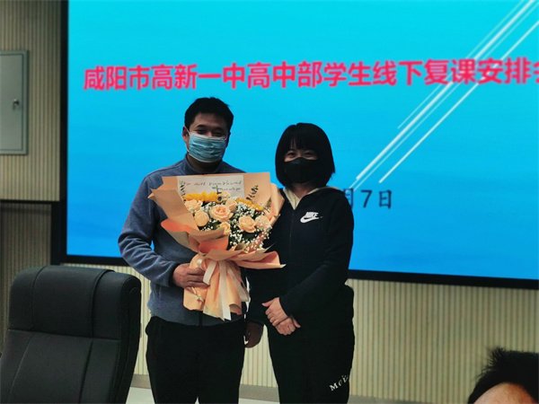 高中部教研主任吴晓燕为两位抗疫教师送上鲜花,聊表心意。